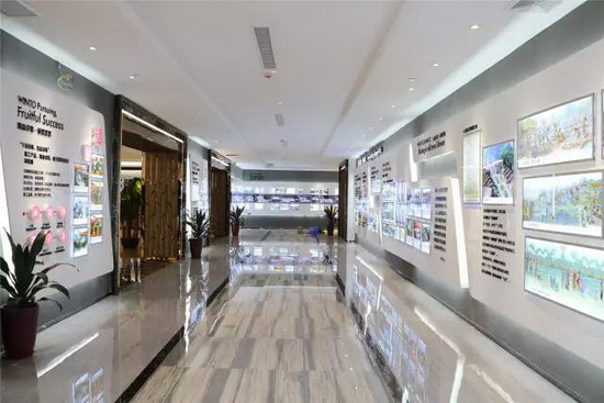 一楼展馆通道各种瓷板画组成的中式屏风、背景墙,以及产品形象画的文化画面,构成了宏陶精工文化的中国风氛围。美轮美奂的展馆设计让置身其间的人喜爱之意溢于言表。