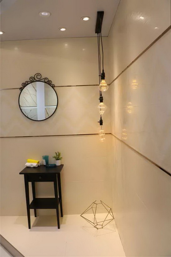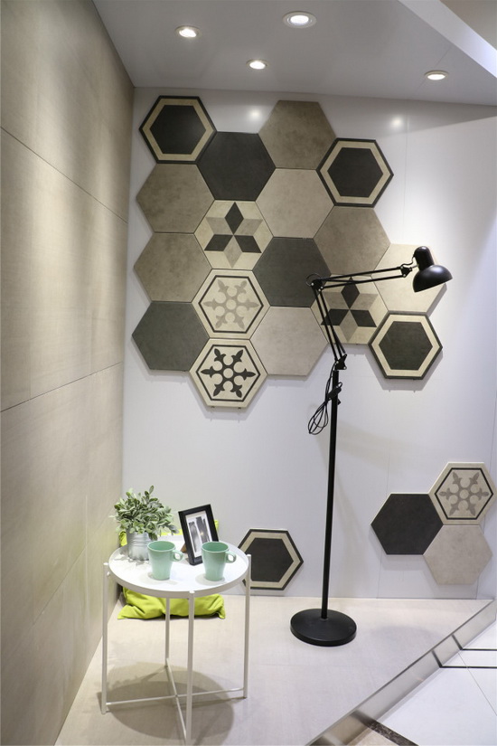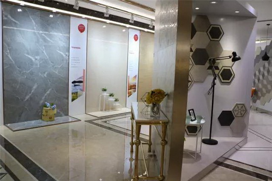 走进展馆宽敞的中空大堂,地面铺贴的宏陶“卡布奇诺”大理石瓷砖与大堂天花上一排排钢琴面板状的发光吊顶相互辉映,加上墙壁不锈钢条型走柱点缀装饰,整个大堂格调低调奢华,简约中又透出龙头企业的气势。