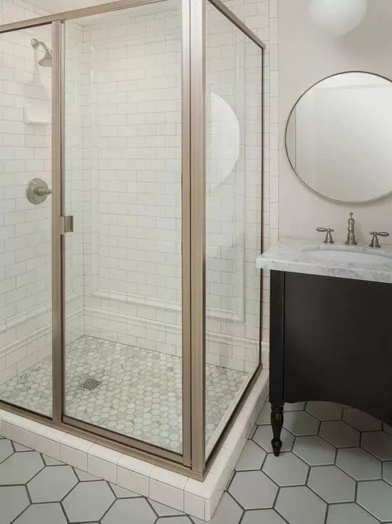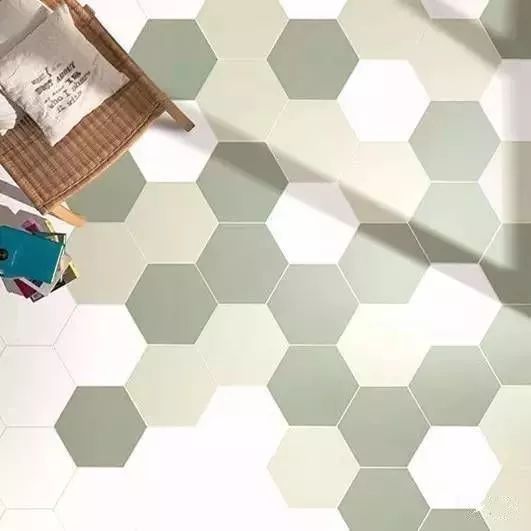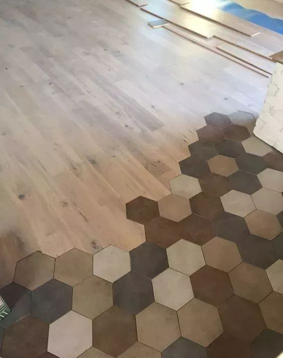 瓷砖的话,如果是花式混拼,那么最好选用规则的六边形瓷砖。因为和地板混拼并做留缝处理后,六边形瓷砖的视觉效果最好最自然。▼