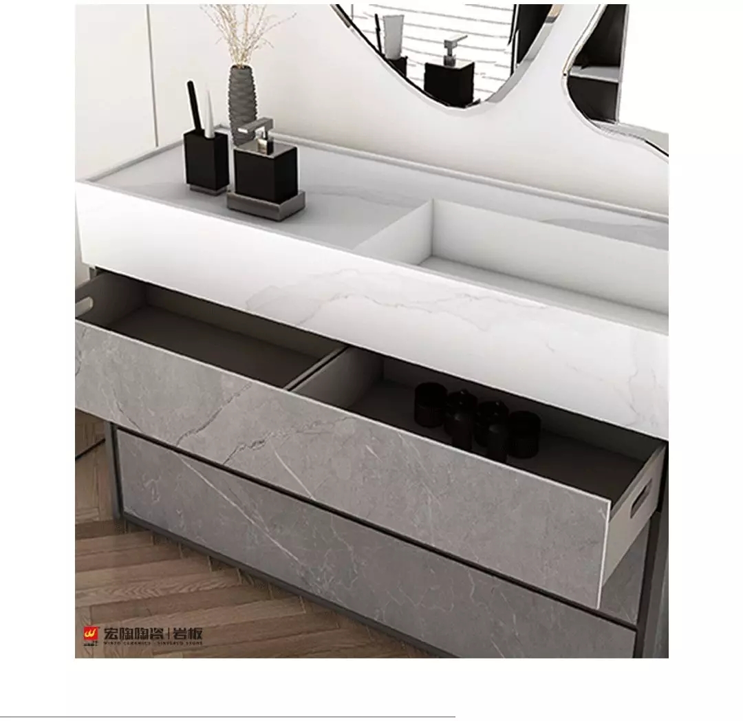 宏陶岩板拥有无与伦比的特质,超高硬度超环境性超抗污性,让浴室柜台面拥有优于大理石的自然效果,整个空间时尚爆棚。