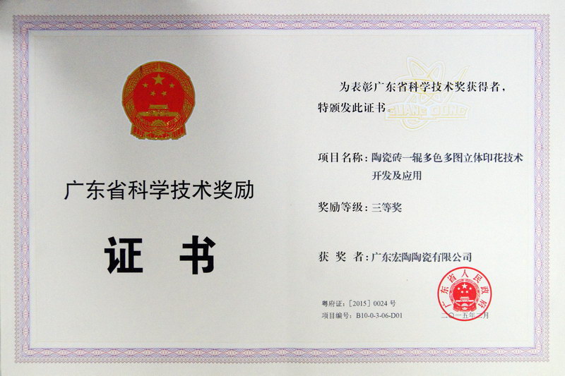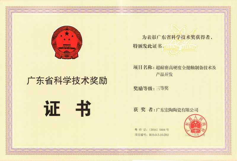 广东省科技三等奖(超耐磨高硬度)(宏陶)