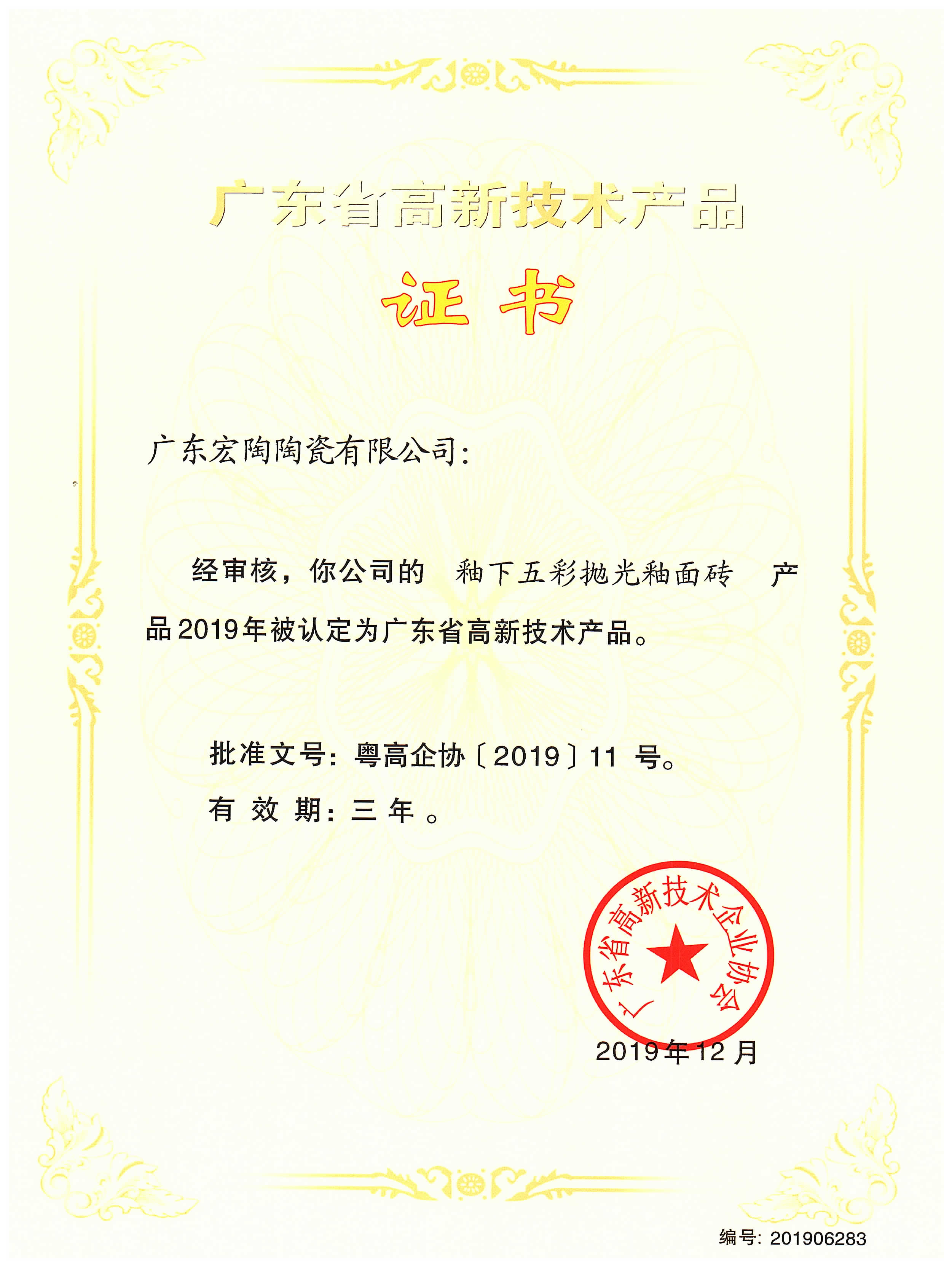 广东省高新技术产品-2019宏陶釉下五彩抛光釉面砖
