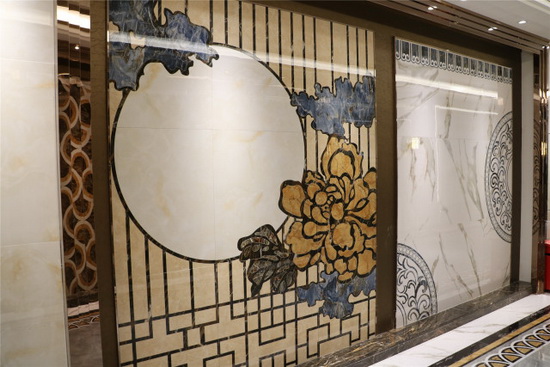 一楼展馆通道各种瓷板画组成的中式屏风、背景墙,以及产品形象画的文化画面,构成了宏陶精工文化的中国风氛围。美轮美奂的展馆设计让置身其间的人喜爱之意溢于言表。