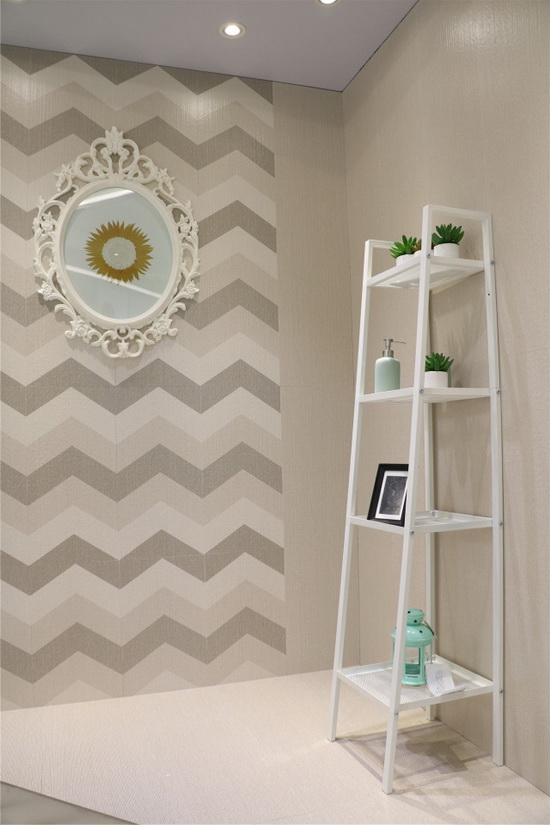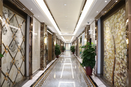 走进展馆宽敞的中空大堂,地面铺贴的宏陶“卡布奇诺”大理石瓷砖与大堂天花上一排排钢琴面板状的发光吊顶相互辉映,加上墙壁不锈钢条型走柱点缀装饰,整个大堂格调低调奢华,简约中又透出龙头企业的气势。