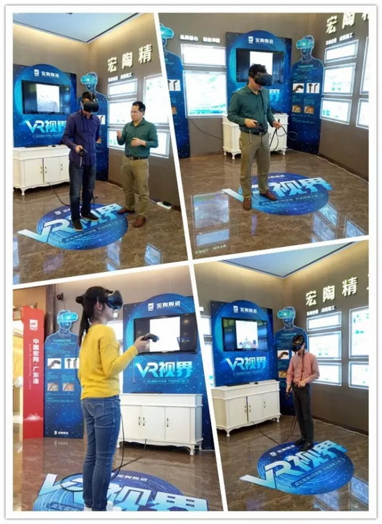 宏陶720°VR实景体验区设立于总部展厅文化区内,带上VR眼镜后,你可以身临其境般的感受新家装修实景,不仅仅是简单的看平面效果图,你可以在其中走动,感受3D效果,可以开门进入客厅、厨房、书房、卫生间等空间,甚至可以打开房间里面的电视、空调、冰箱等,且可以根据自己的喜好更换瓷砖,让装修更加生动有趣。