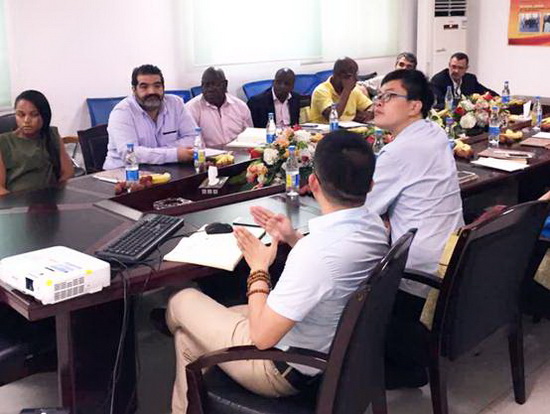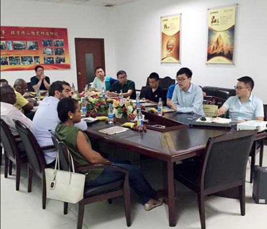 外国嘉宾在宏陶陶瓷展厅参观过程中,对宏陶陶瓷“新、精、美”的瓷砖产品赞不绝口。宏陶出口部领导为到访客人详细介绍了宏陶陶瓷的企业实力、品牌文化和产品优势。罗安达市市长对宏陶陶瓷强大的品牌实力给予了高度的评价,并表示有意向选购宏陶仿古砖、釉面砖和瓷质抛光砖产品作为罗安达市区新建学校的装饰用砖。