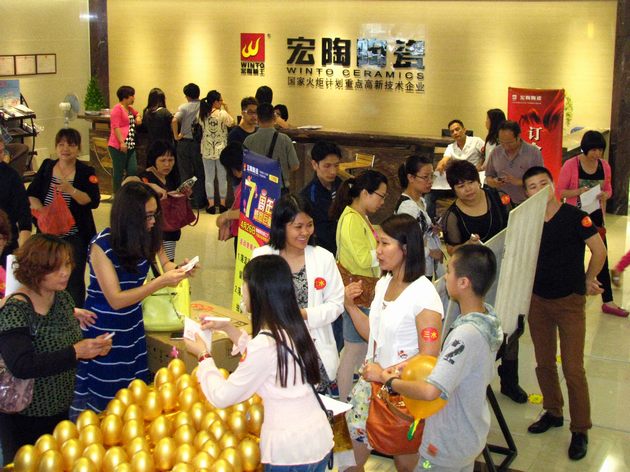 4月26日中午刚刚下过一阵倾盆大雨,天空露出了灿烂的笑脸。就在这天下午两点时分,宏陶陶瓷佛山三水经销商刚在三水举行7周年店庆后,领着60多位VIP客户直奔宏陶品牌总部展厅,举行了一次别开生面的开心团购活动。