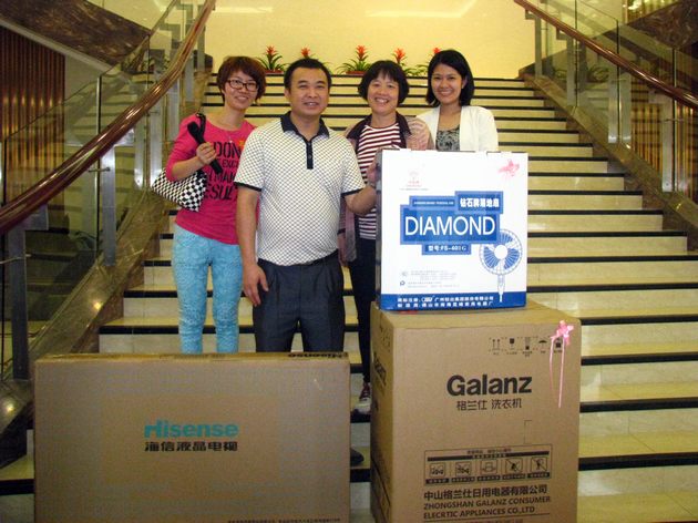 图8、抽中液晶电视的业主(中间)笑逐颜开与经销合影