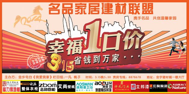 2014年3月15日下午5时30分,山东济宁宏陶陶瓷专卖店与当地志邦厨柜、福力得地板、欧派衣柜、爱尚壁纸、澳斯曼卫浴、奥普吊顶、许氏门业、立邦漆、大自然木门等10家包括陶瓷产品在内的建材家居知名品牌强强联手,在山东济宁市金宇建材城一楼大厅,举行了一场以“幸福1口价,省钱到万家”为主题的金乡名品建材家居联盟大型夜宴团购会活动。
