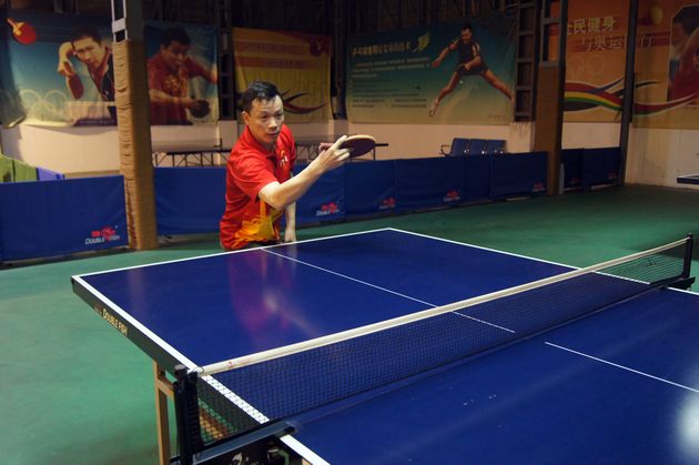 图5、乒乓球友谊赛中,宏陶市场总监霍达炎旋转式开球