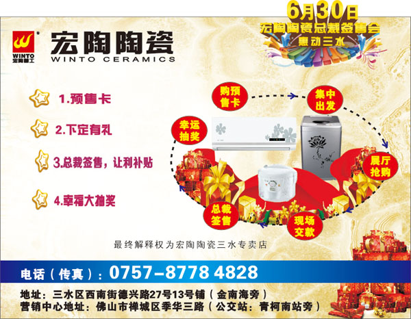 宏陶陶瓷广东佛山三水专卖店总裁签售会真情回馈大型团购活动将于2013年6月30日在宏陶陶瓷总部展厅隆重上演。