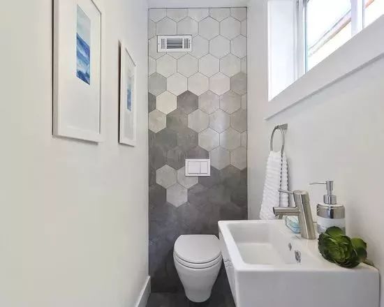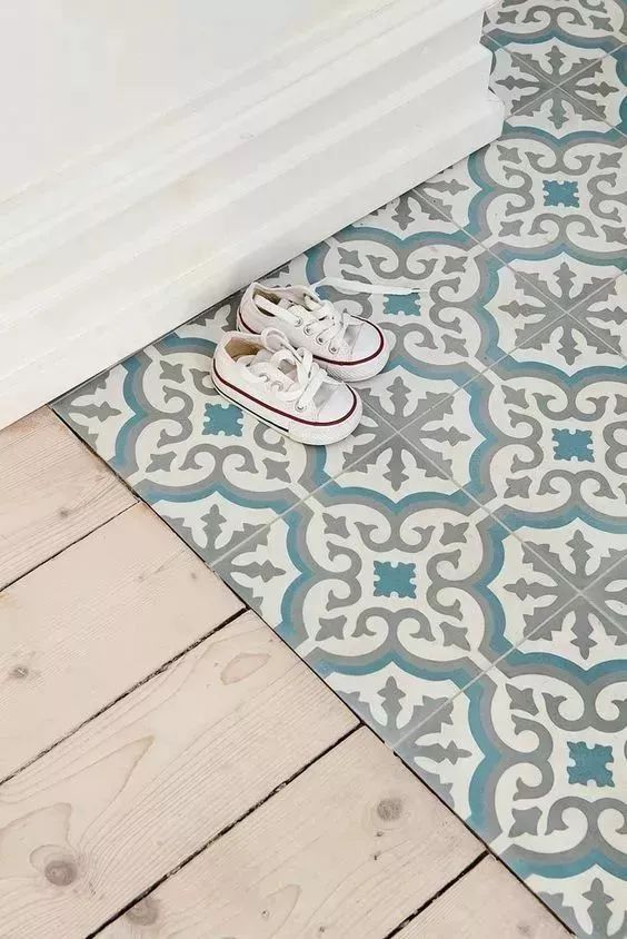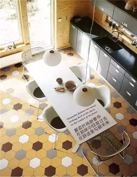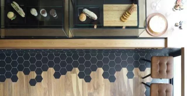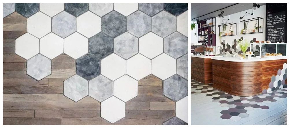 瓷砖的话,如果是花式混拼,那么最好选用规则的六边形瓷砖。因为和地板混拼并做留缝处理后,六边形瓷砖的视觉效果最好最自然。▼