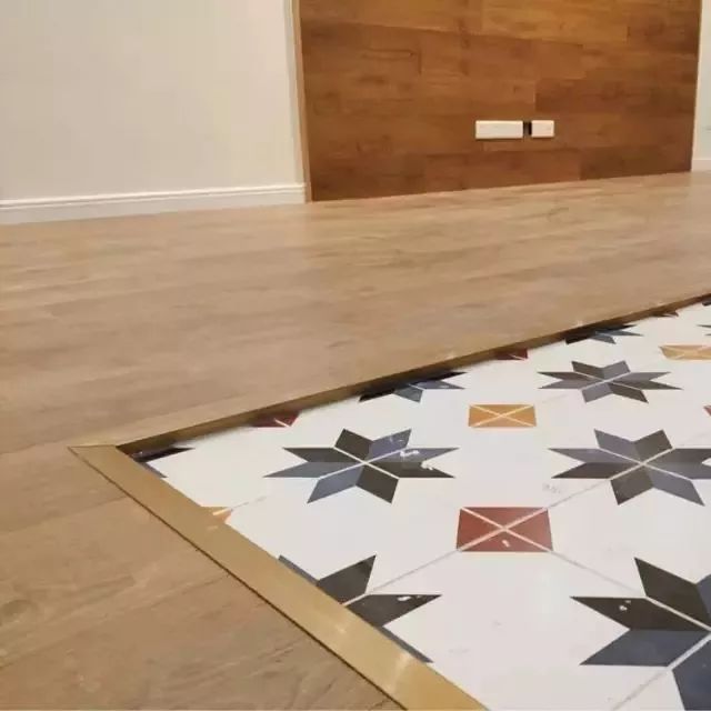 平压条收边:如果想让两种材质的混拼显得更自然,一定要做好找平工作。找平工作做好之后,就可以直接用金属平压条进行接缝的收边。▼