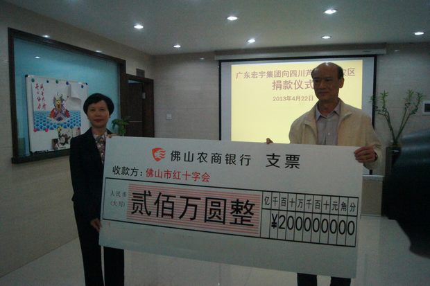 22日下午,企业副总经理欧家瑞在佛山市政府抗震救灾中心向佛山市副市长麦洁华转交了支票,当晚,企业还出席了由南方广播影视传媒集团联手南方报业传媒集团、羊城晚报报业集团、广东省慈善总会、广东省红十字会、广东南方电视台等单位主办,南方电视台承办,广东人民广播电台、广东电视台、壹基金协办的“雅安要稳住 广东在行动”慈善爱心晚会。