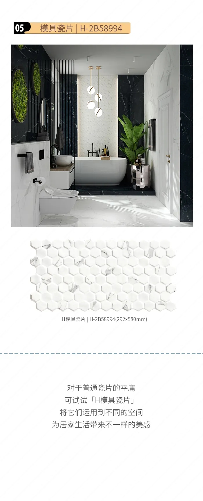 所以,对于平时我们看着平庸的普通瓷片,可以试着将宏陶瓷砖的H模具瓷片,运用到不同的瓷砖装修空间里面,势必会给家居生活带来不一样的美感体验!
