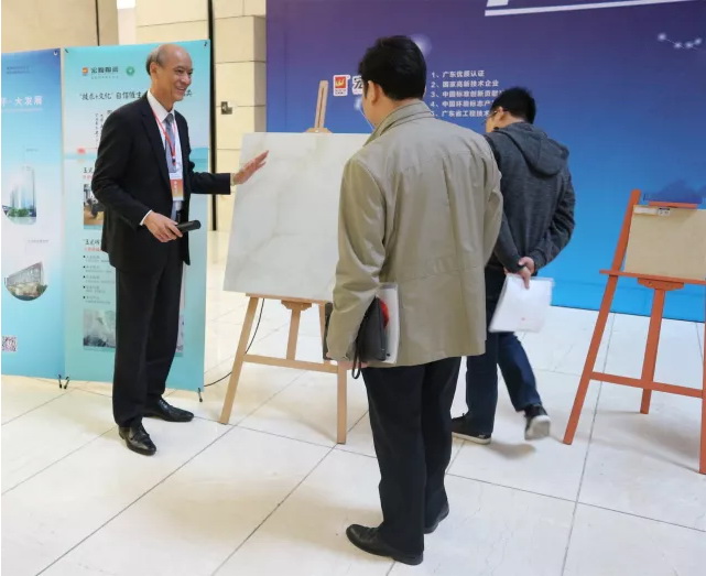 欧总为广东电视台记者介绍宏陶“玉瓷砖”
